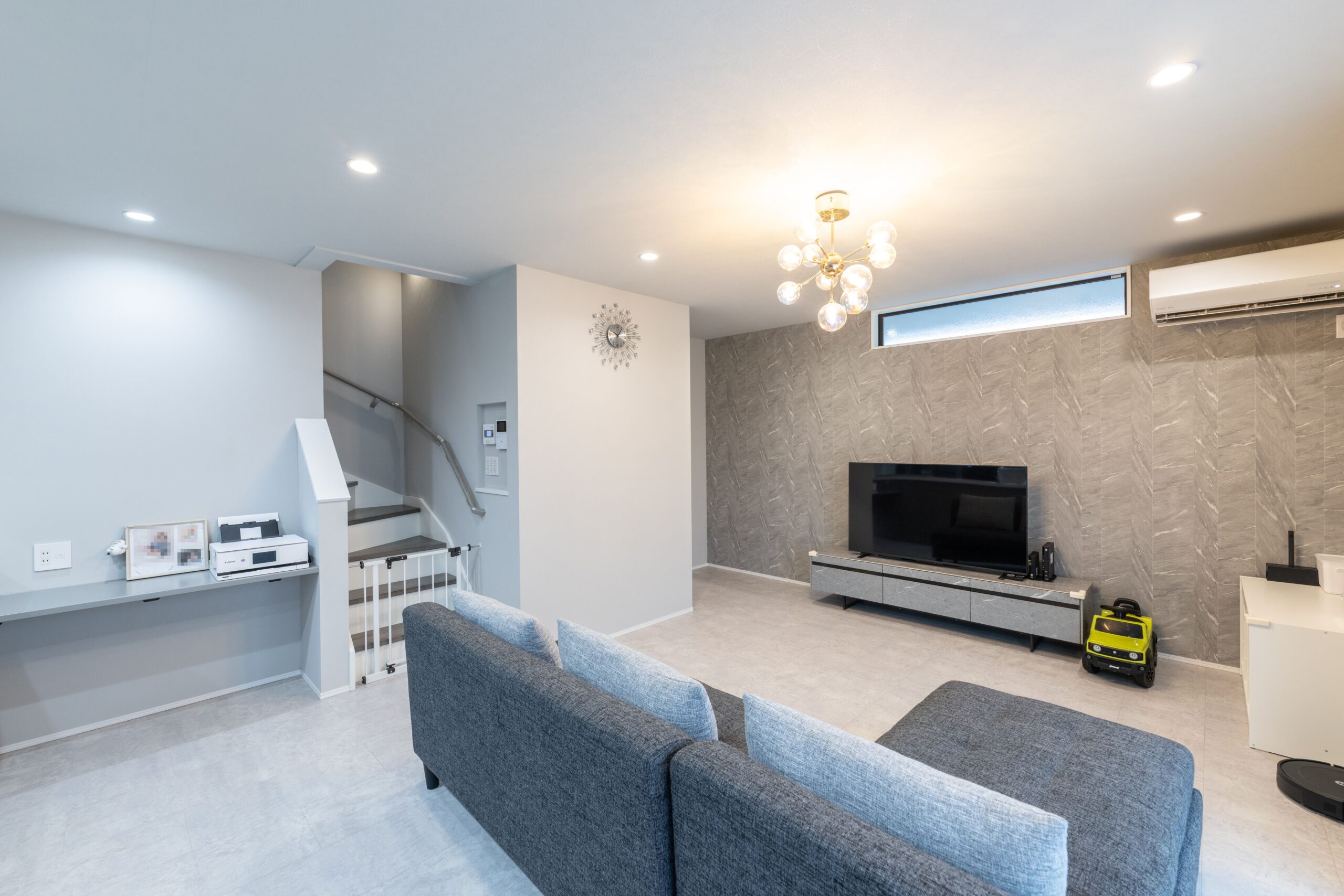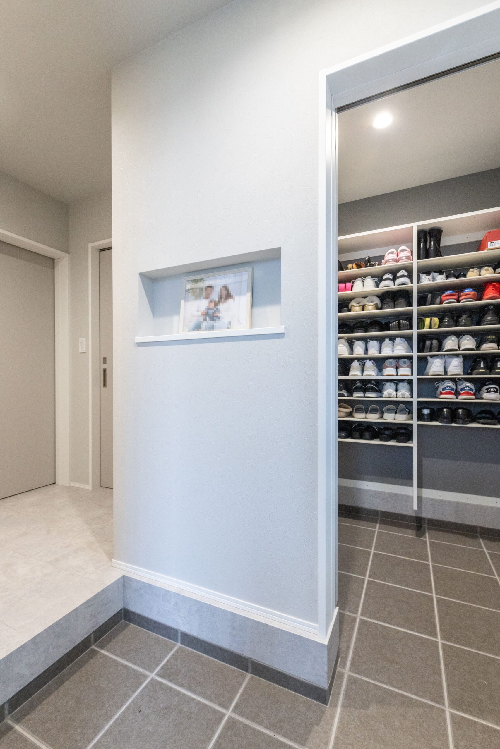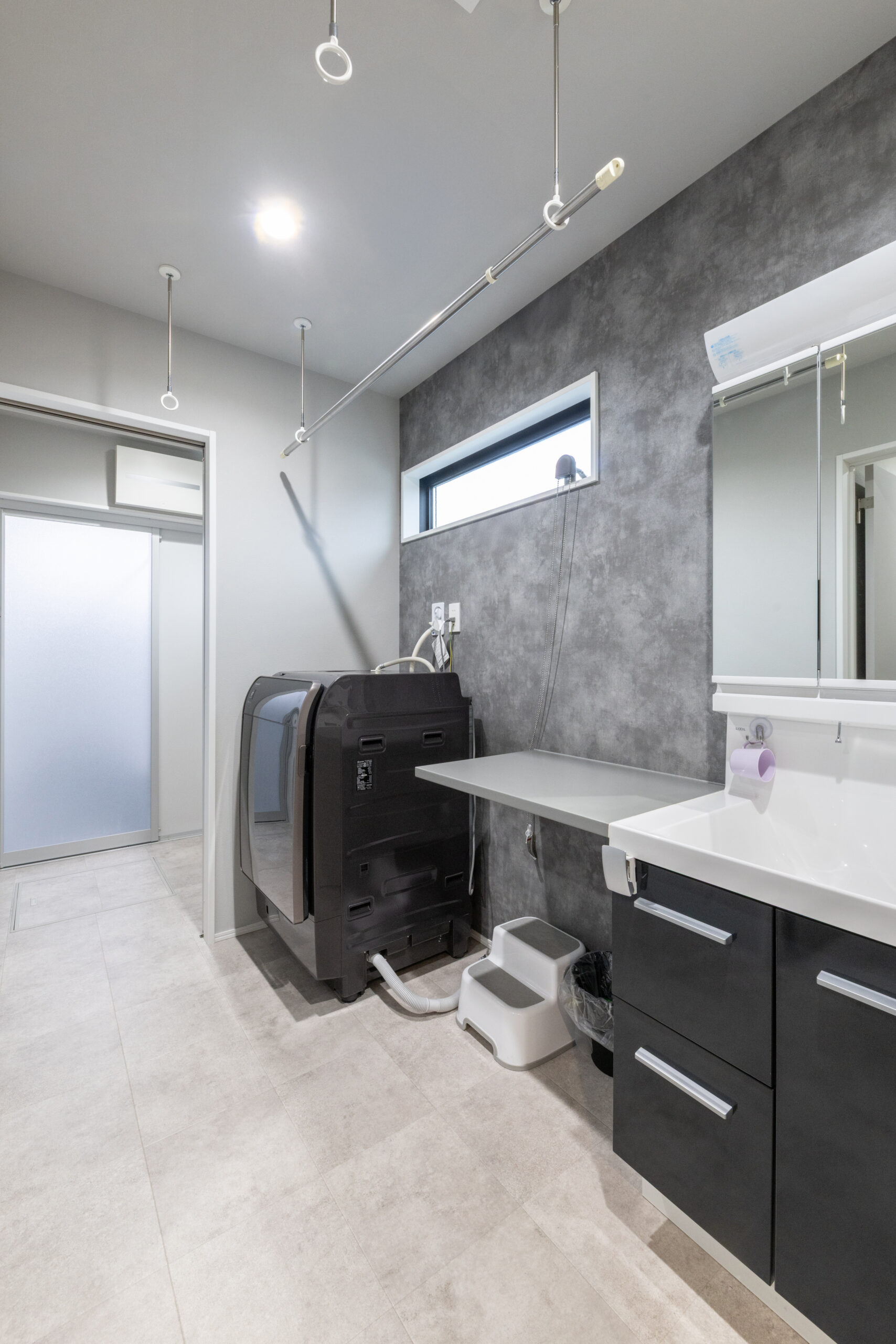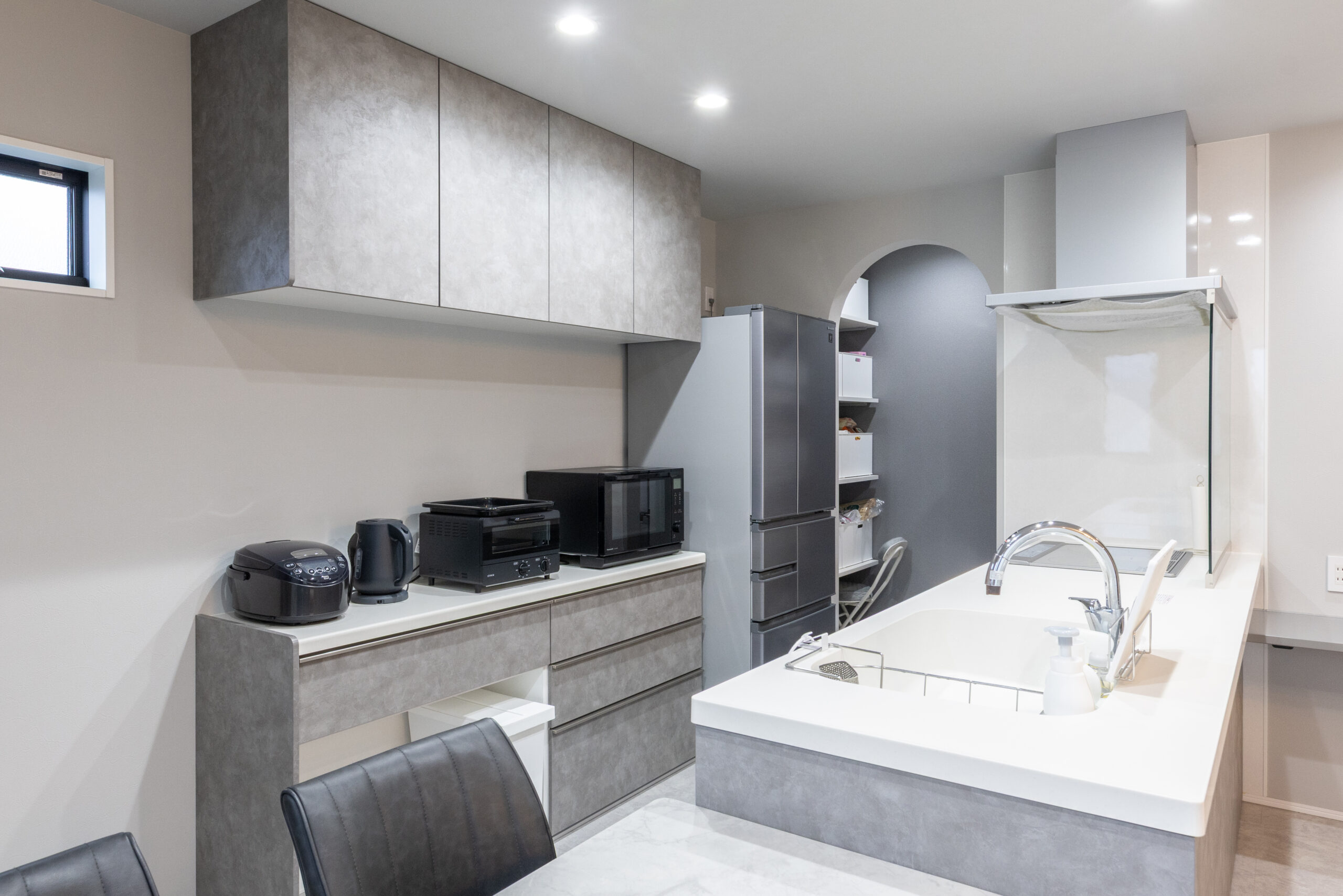 収納をたくさん取り、動線もこだわり、クロスや床の色にこだわりました。木目の雰囲気を入れず、グレーを中心とした色合いでとても気に入っています。