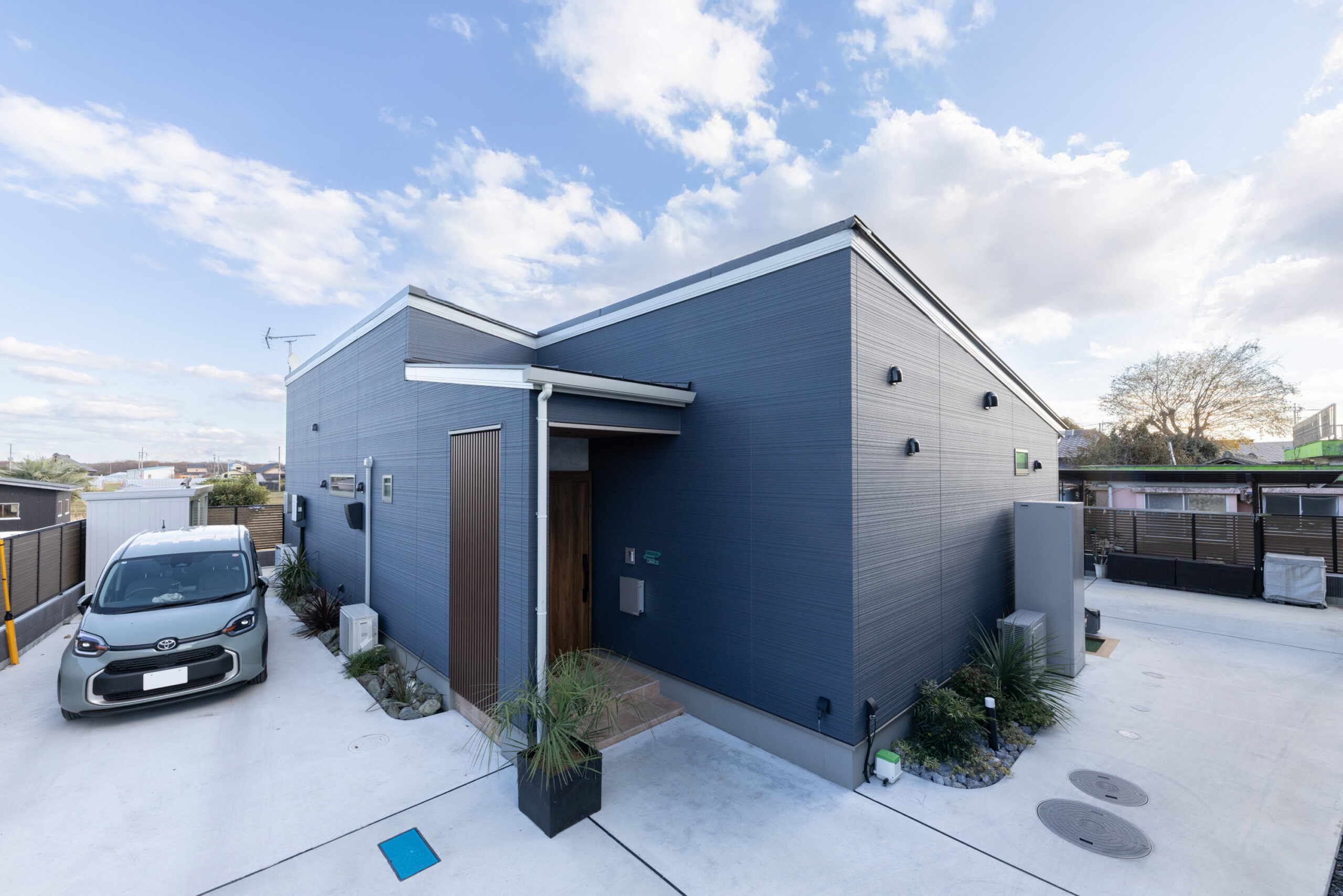 #平屋 #外観 #サイディング #光セラ #シュトラール18 #アトランティックチタンブルー #フィエルテ #チタンコンクリート #Kmew #タイル #コートライン #LIXIL #植栽