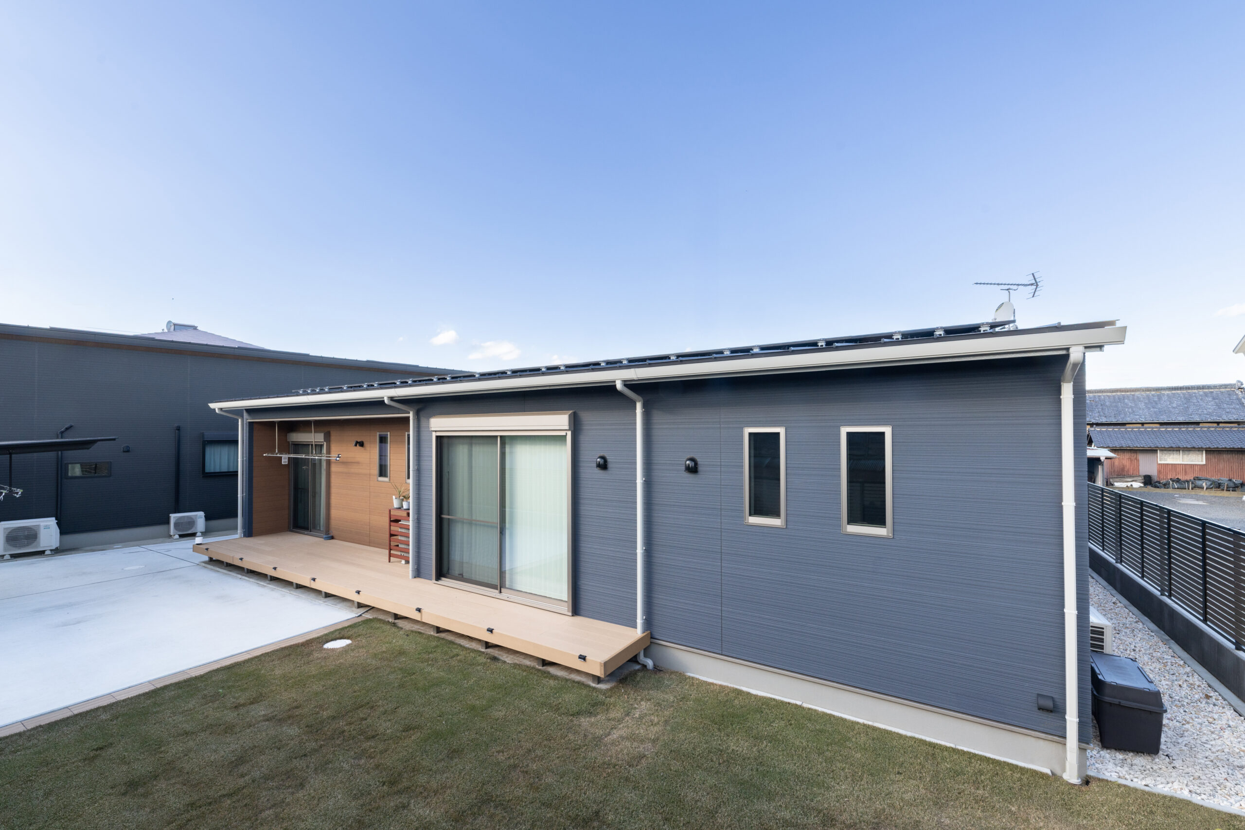 #平屋 #外観 #サイディング #光セラ #シュトラール18 #アトランティックチタンブルー #エーデルウッド #チタンオレンジ #Kmew #樹脂デッキ #樹ら楽ステージ(ライトウッド) #LIXIL