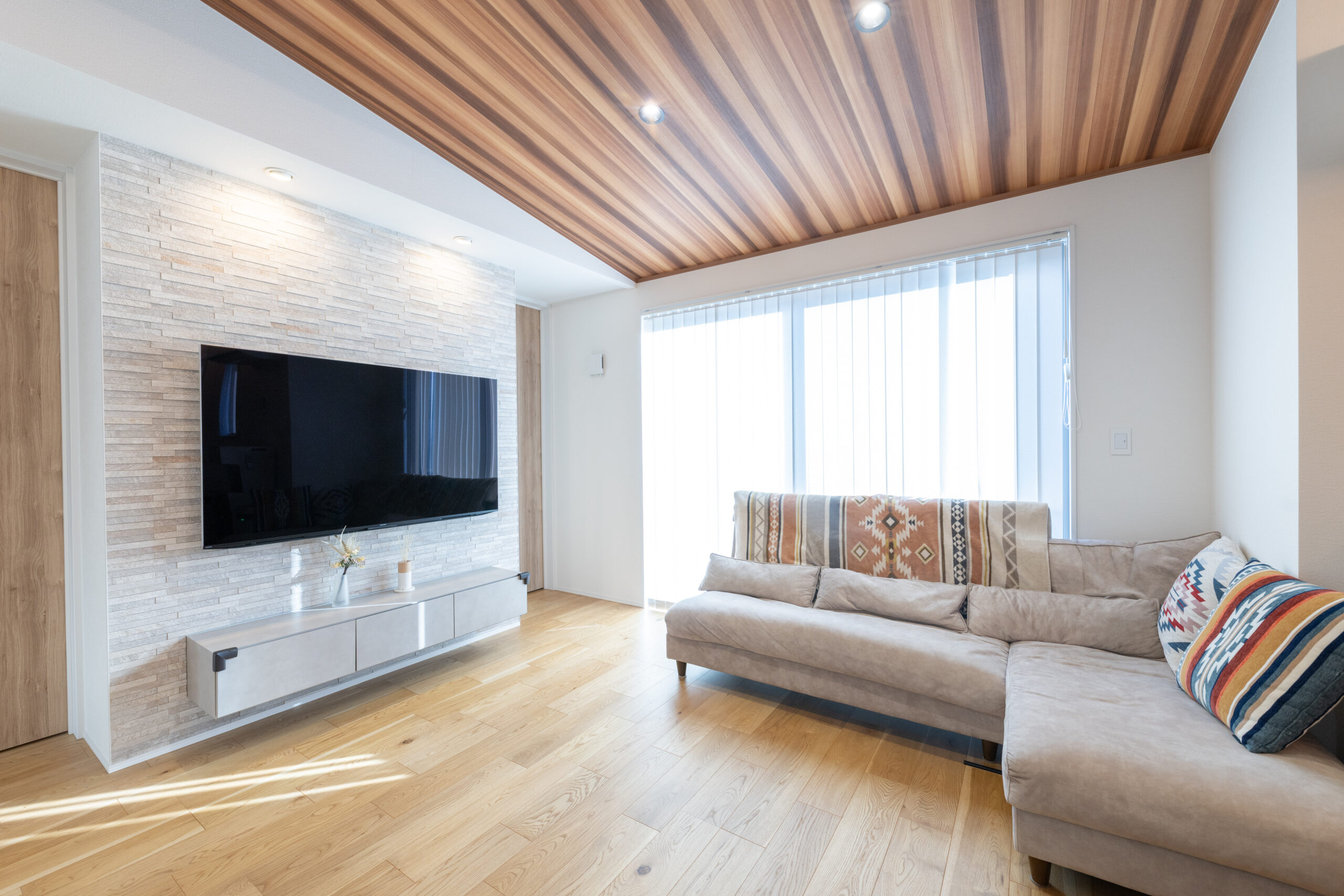 #LDK #19.7帖 #勾配天井 #明るいリビング #床 #ライブナチュラルMRX(オーク)#朝日ウッドテック #TVボード #パモウナ マージンキャビネット