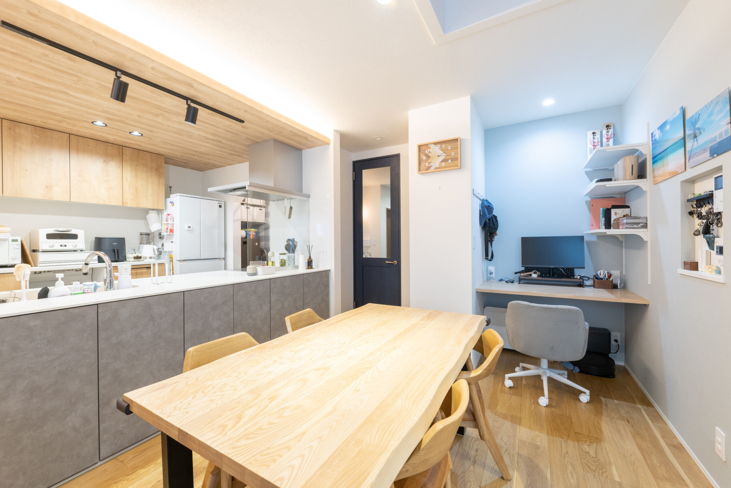 #ダイニング #キッチン #カップボード #ES #グレージュスタッコ #ライトグレイン #LIXIL #横並びダイニング #下がり天井 #間接照明 #ワークスペース #建具
