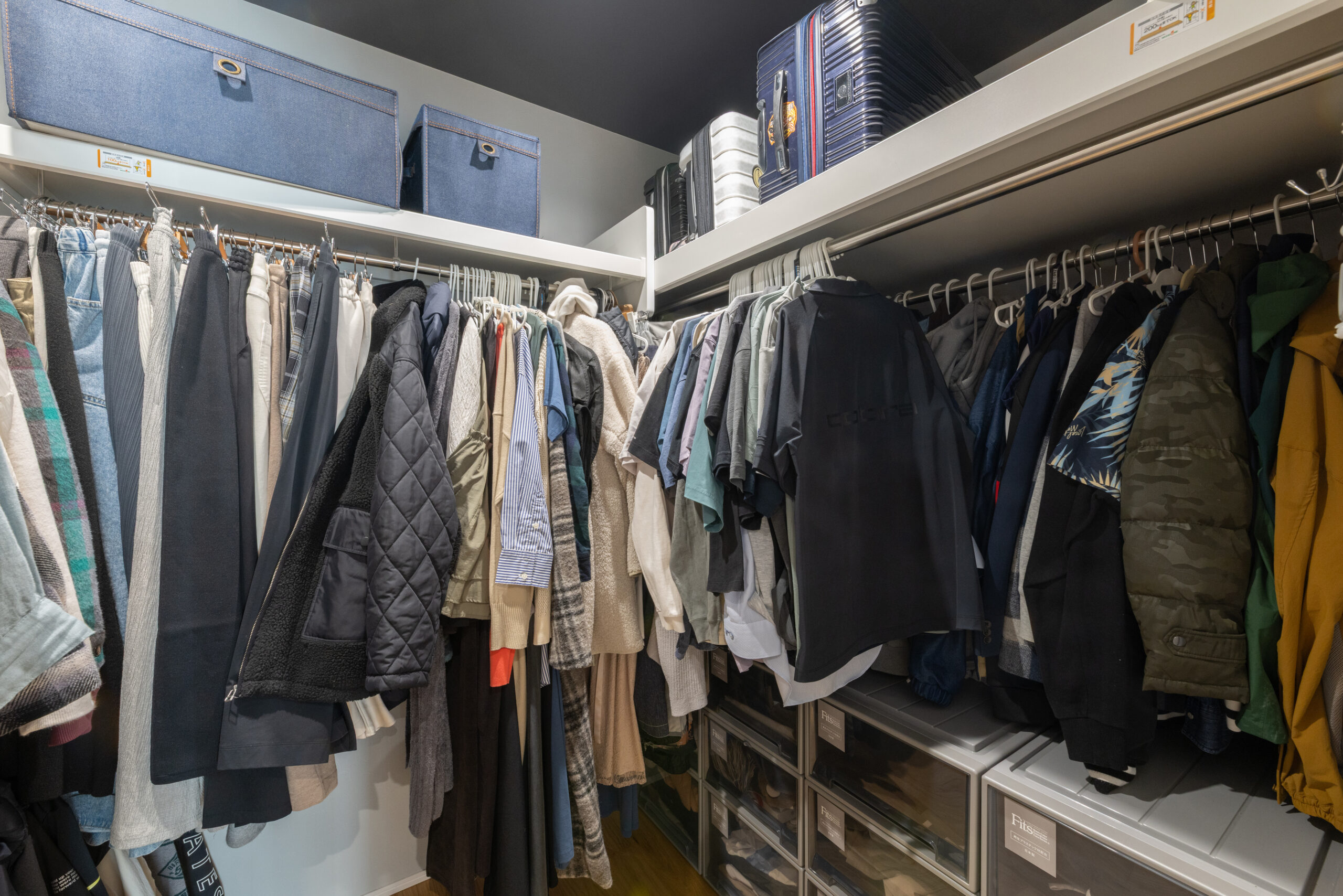 #ウォークインクローゼット #リビングに隣接 #枕棚 #ハンガーパイプ #奥行きを設けてパイプを2本に #衣装ケースのスペースも #収納力◎